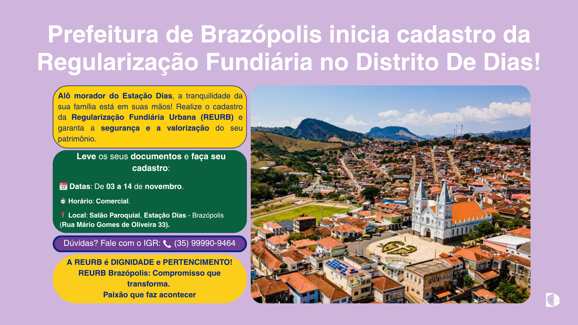 30 de outubro de 2025 Prefeitura de Brazópolis inicia cadastro da Regularização Fundiária no Distrito De Dias! LEIA MAIS REURB