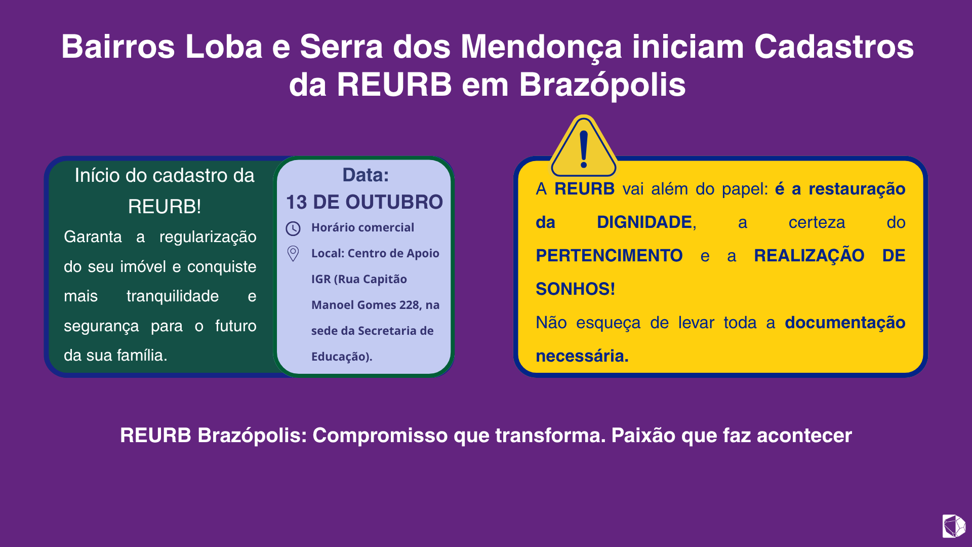 10 de outubro de 2025 Bairros Loba e Serra dos Mendonça iniciam Cadastros da REURB em Brazópolis LEIA MAIS REURB