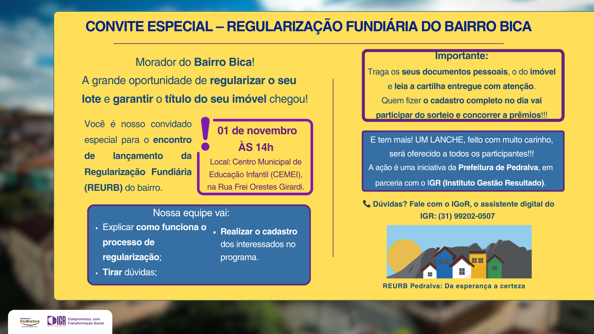 25 de novembro de 2025 Prefeitura de Pedralva e IGR iniciam levantamento porta a porta no bairro Bica para avançar com a Regularização Fundiária LEIA MAIS REURB